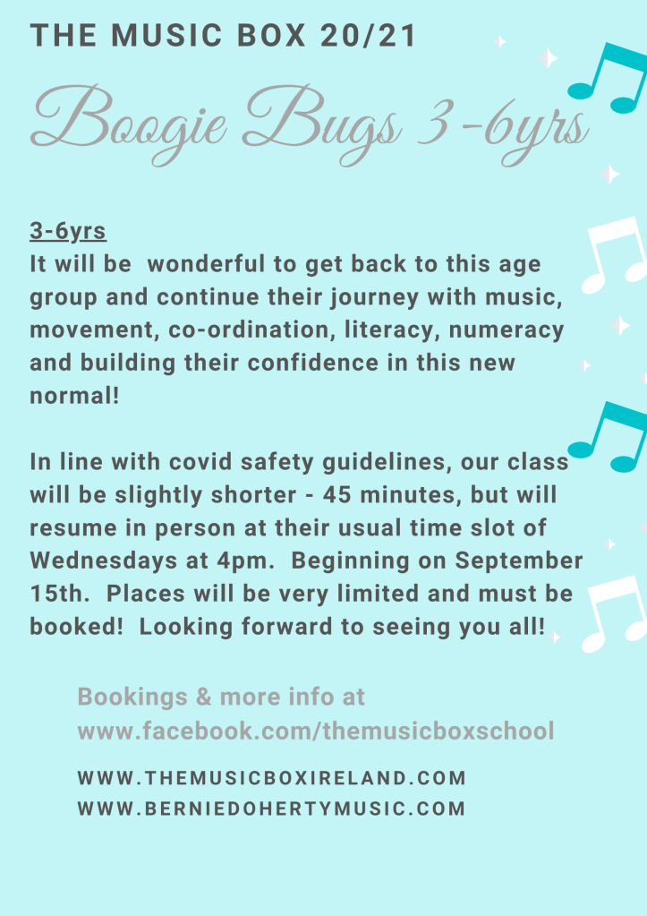 Some classes will be in person – Singing/Music, Guitar Academy & Boogie Bugs 3-6yrs (45 mins long) and some will be online – Boogie Bugs 0-3yrs (30 mins). As always, we will pay at the start of each month/block, and paypal will be available for online classes as well as in person if you prefer that. Please do get in touch with any questions you may have